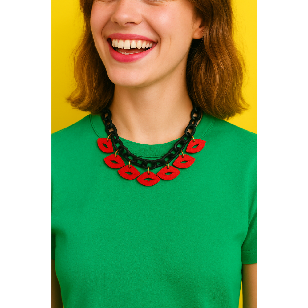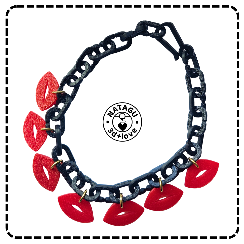 Atrévete a lucir tus pecados con estilo. El collar "Siete Pecados" está impreso en 3D con una cadena negra mate y siete colgantes en forma de labios rojos intensos, listos para desatar miradas, sonrisas... y tentaciones.