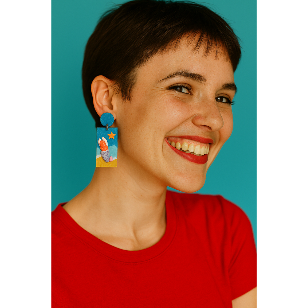 Sumérgete en un mar de color y fantasía con estos pendientes impresos en 3D que capturan el instante más bonito del verano: una sirenita descansando en la arena mientras mira una estrella.